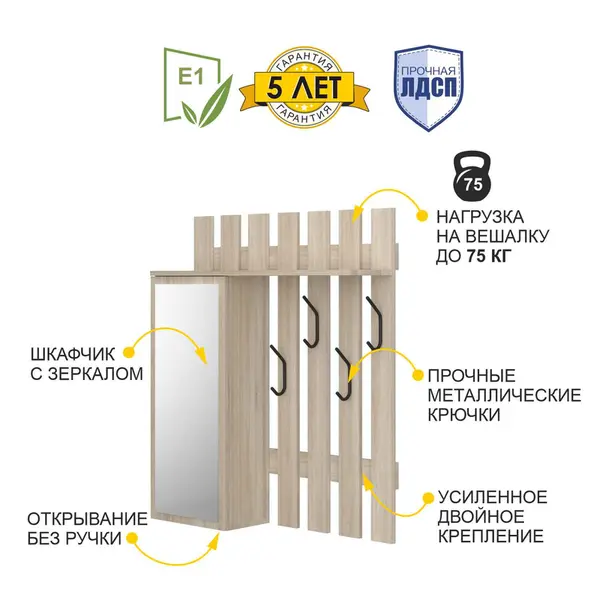 • Вешалка настенная для прихожей изготовлена из ЛДСП 16 мм класса эмиссии Е1. Данный материал безопасен для здоровья и рекомендован к производству мебели для прихожих, спален и детских комнат. Материал выдерживает min 200 циклов истирания (по ГОСТу min 65) - это больше, чем у многих производителей