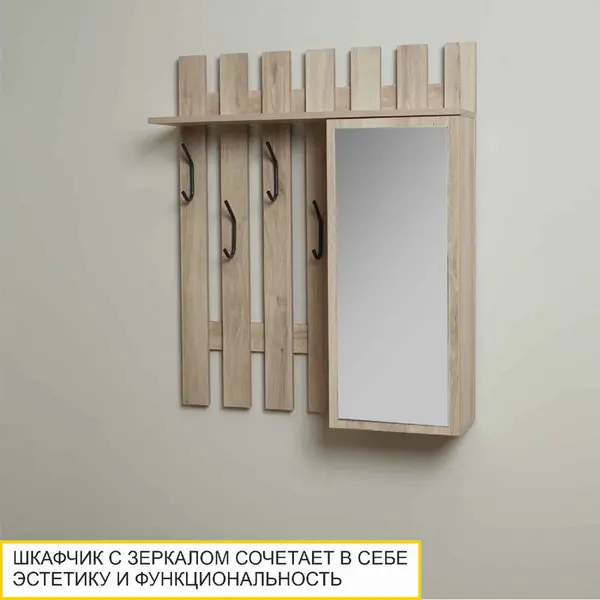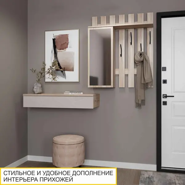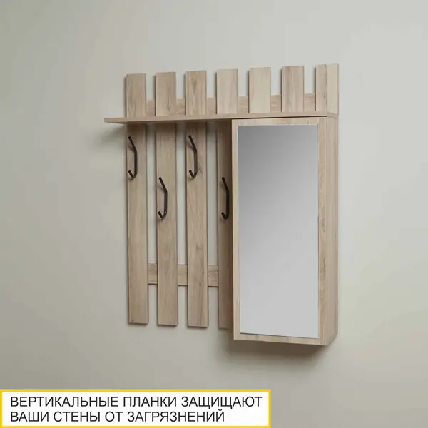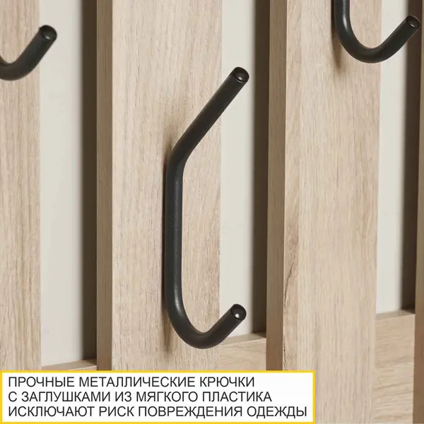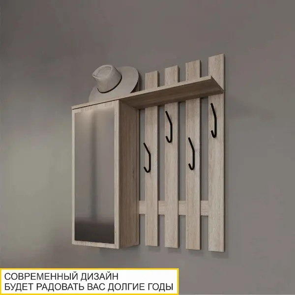 Вешалка выполнена в серо-бежевых оттенках натурального дерева, которые являются наиболее универсальными. Они отлично смотрятся в интерьерах любой цветовой гаммы, придавая им модную нотку экостиля. А имитация натуральной древесной текстуры создает ощущение уюта.
