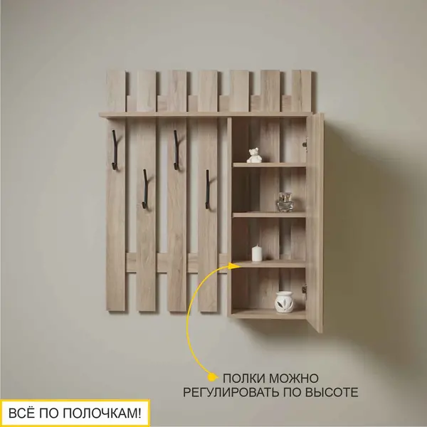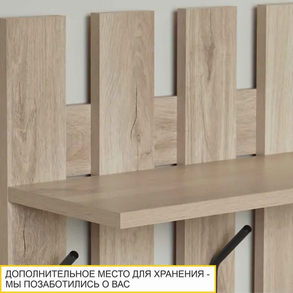 • Вешалка в прихожую оснащена открытой полкой, что обеспечивает дополнительное место для хранения головных уборов и аксессуаров. Полка выдерживает равномерно распределенную нагрузку до 25 кг.