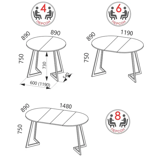 • Обеденный стол имеет три варианта трансформации - один компактный для 4 персон (диаметром 89 см) и два с увеличенной столешницей на 6 (119 см) или 8 персон (148 см).