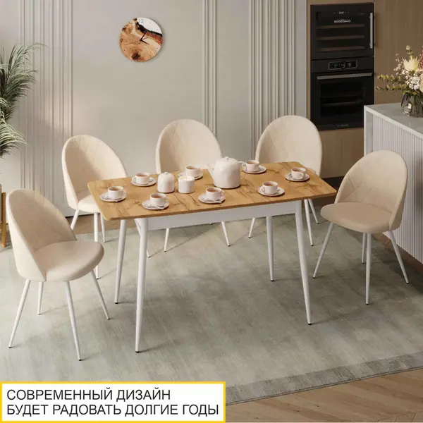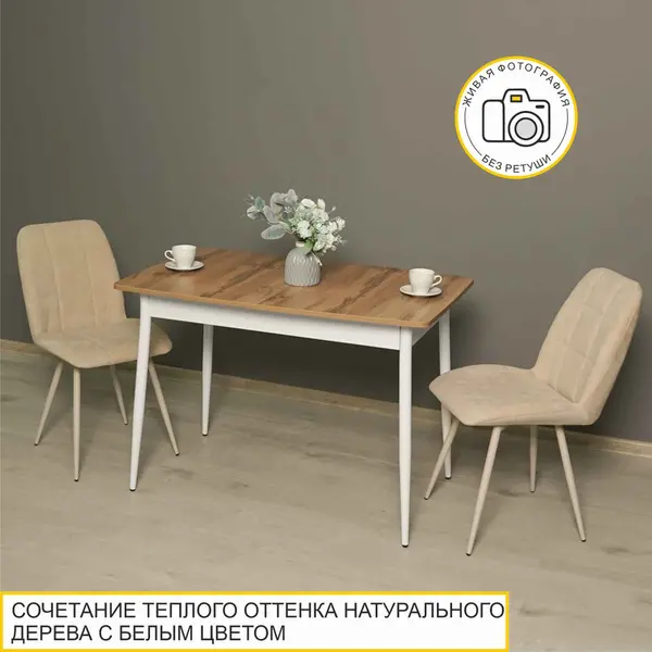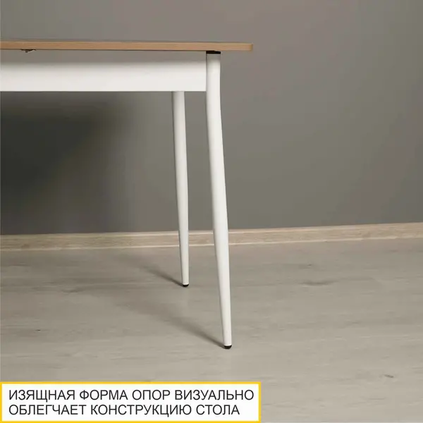Стол выполнен в теплом оттенке натурального дерева, который отлично сочетается с белыми металлическими опорами. Обеденный стол в таком цветовом исполнении добавляет интерьеру свежести и визуально расширяет пространство.