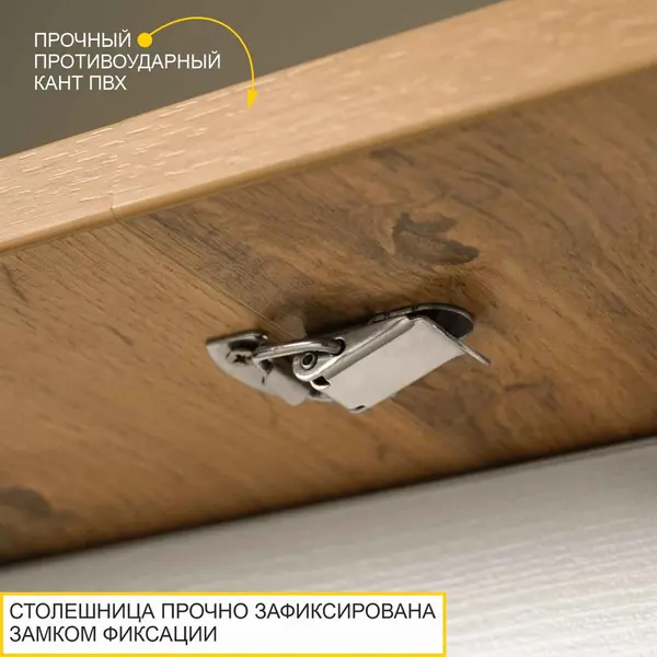 • Противоударный кант ПВХ толщиной 2 мм и 0,4 мм защищает края стола кухонного раскладного от сколов и влаги, увеличивает срок эксплуатации изделия и сохраняет его внешний вид на долгие годы.