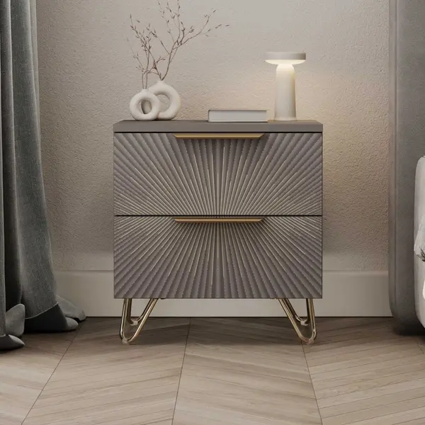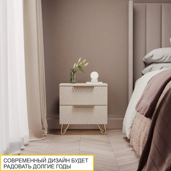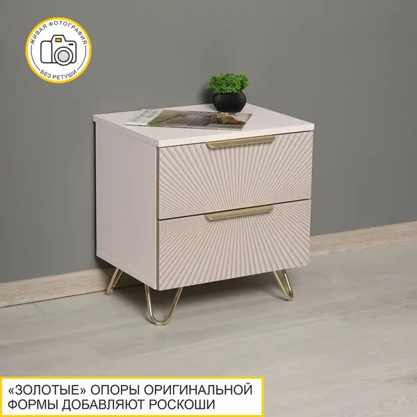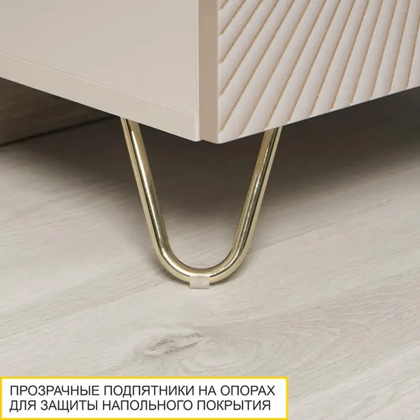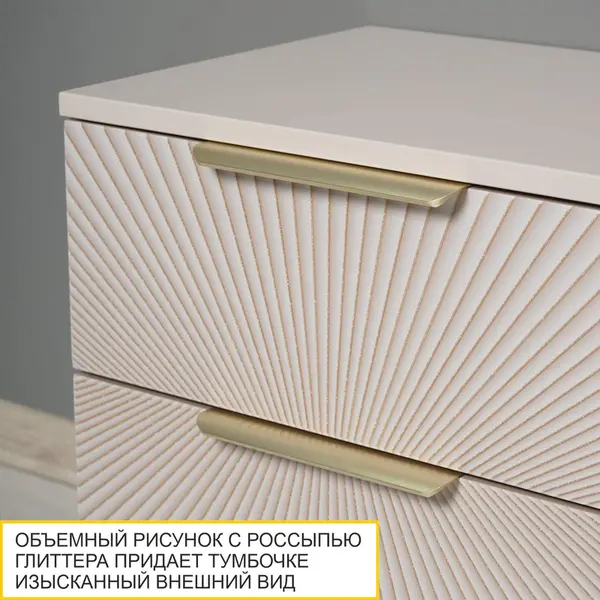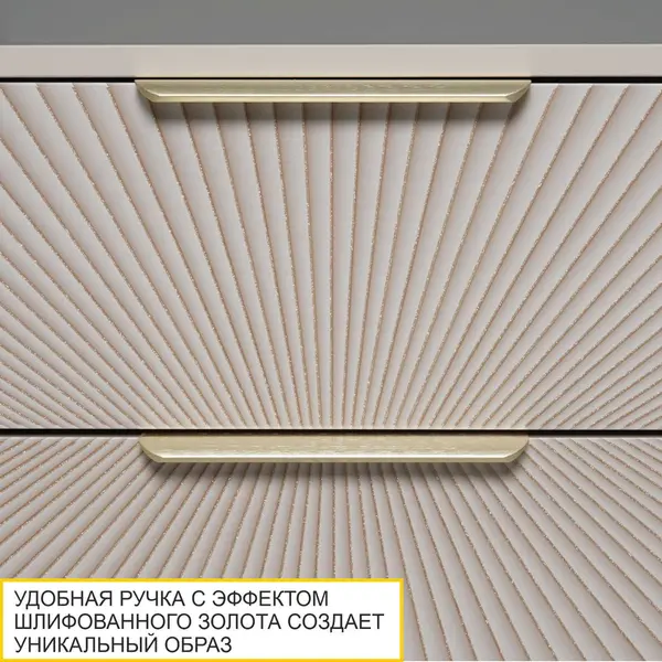 • Изящная металлическая ручка эргономичной формы с эффектом шлифованного золота обеспечивает легкое открывание, а ее лаконичный дизайн придает тумбочке гармоничный внешний вид.