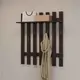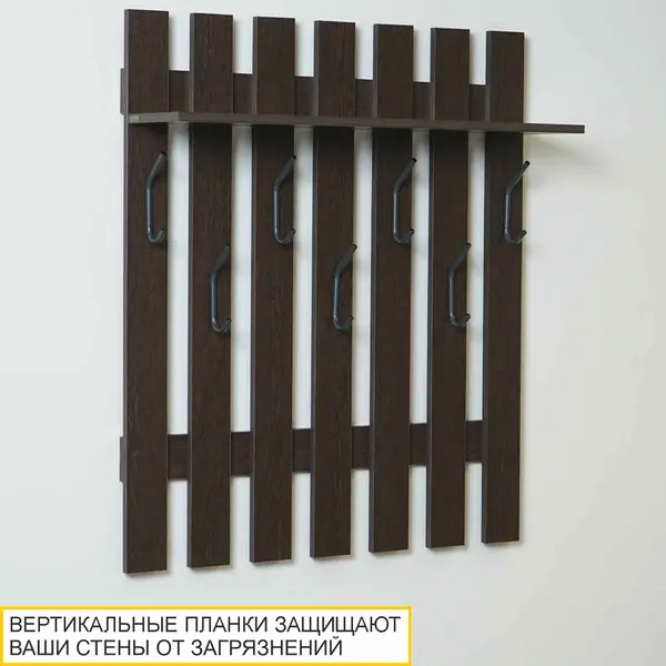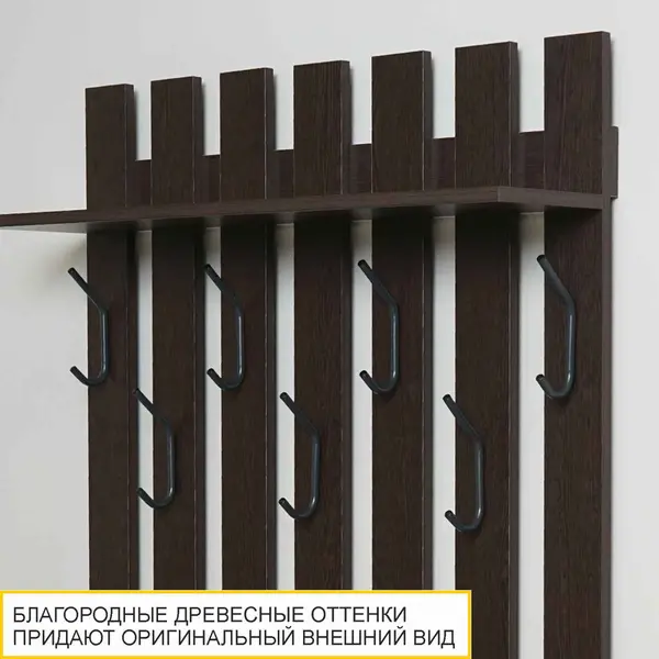 Настенная вешалка выполнена в темном древесном оттенке. Она выглядит благородно и придает интерьеру оригинальный внешний вид.