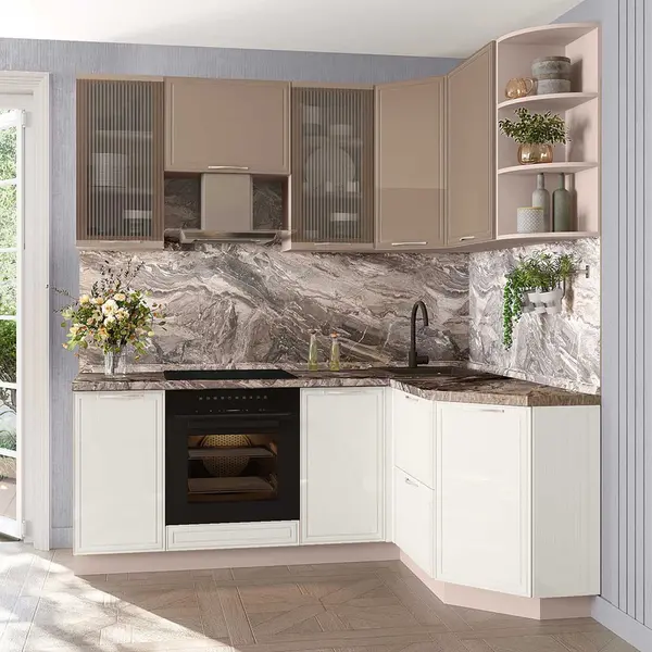 • Кухня может быть выполнена в едином оттенке «Крем-брюле», либо с навесными шкафами в контрастном оттенке цвета «Мокко».