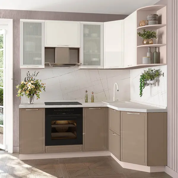 • Гармоничное сочетание теплого цвета «Мокко» и светлого «Крем-брюле» дарит кухне спокойствие и уют.