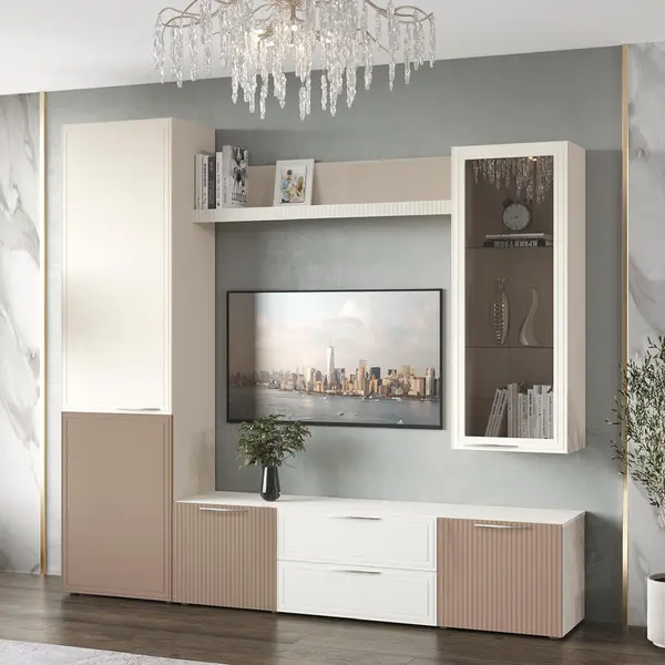 • В комплект шкафов входят межсекционные стяжки. Они позволяют выровнять модули в одну линию для аккуратного внешнего вида гостиной.