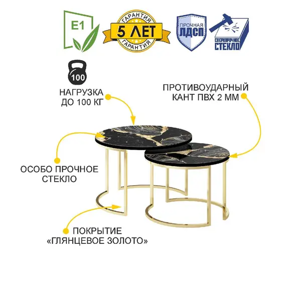 • Оригинальный и компактный комплект из двух журнальных столиков легко комбинируется между собой, а также может использоваться отдельно друг от друга, создавая интересные интерьерные решения. За одну цену Вы получаете два журнальных стола.