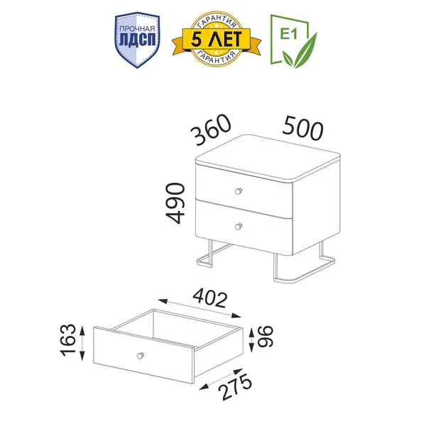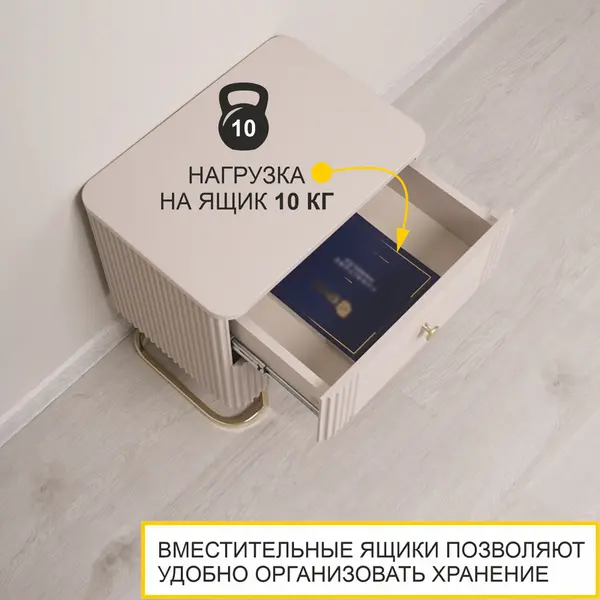 Вместительные выдвижные ящики без внутренних перегородок позволяют комфортно разместить нужные вещи. Шариковые направляющие обеспечивают плавный бесшумный ход и длительный срок эксплуатации изделия, а полное выдвижение помогает быстро и легко найти необходимые вещи. Вы сможете хранить книги, очки, зарядные устройства и другие мелочи, которые всегда должны быть под рукой. Ящик выдерживает нагрузку до 10 кг.