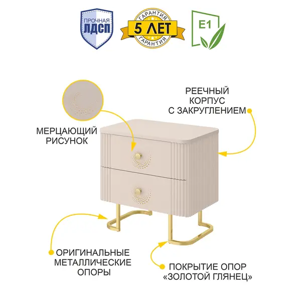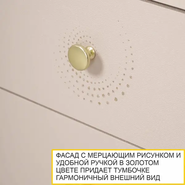 Одной из главных особенностей данной тумбы является мерцающий рисунок на фасаде, который привлекает внимание и создает атмосферу уюта. Изящная ручка в золотом цвете обеспечивает легкое открывание. Оригинальные металлические опоры в цвете золотой глянец придают тумбочке нотку роскоши и современности. Реечный корпус с закруглением добавляет мягкости и гармонии, делает тумбочку прикроватную не только стильной, но и безопасной для использования в спальне.