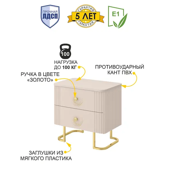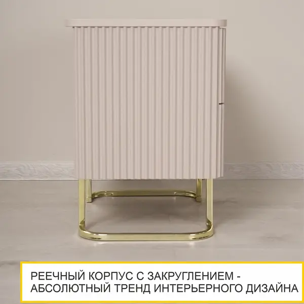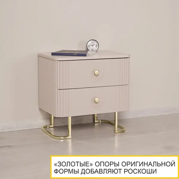 Тумба прикроватная выполнена в спокойном цвете «Кашемир», в сочетании с роскошными золотыми опорами - это беспроигрышный вариант дизайна в доме.