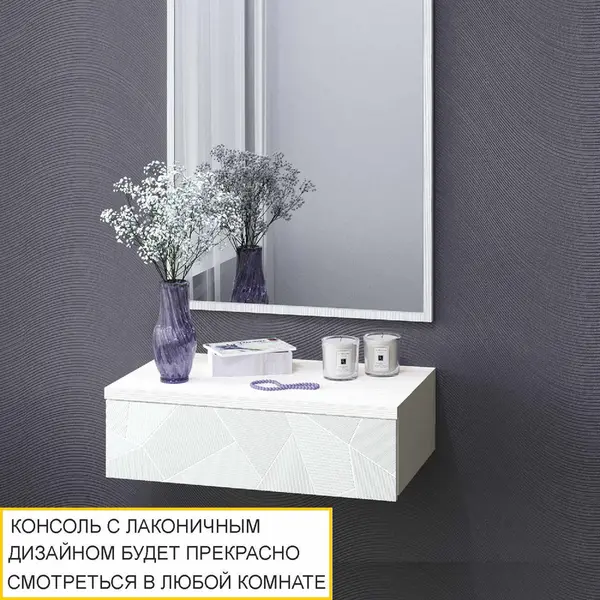 Консоль выполнена в актуальном белом цвете с легкой имитацией древесной текстуры. Белый цвет является актуальным и универсальным решением. Его можно сочетать с любыми другими цветами и фактурами. В то же время он добавляет интерьеру свежести и визуально расширяет пространство.