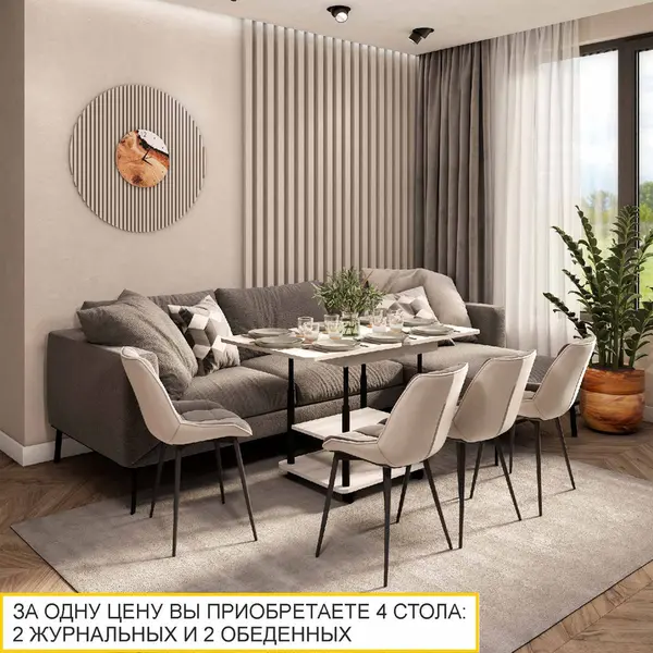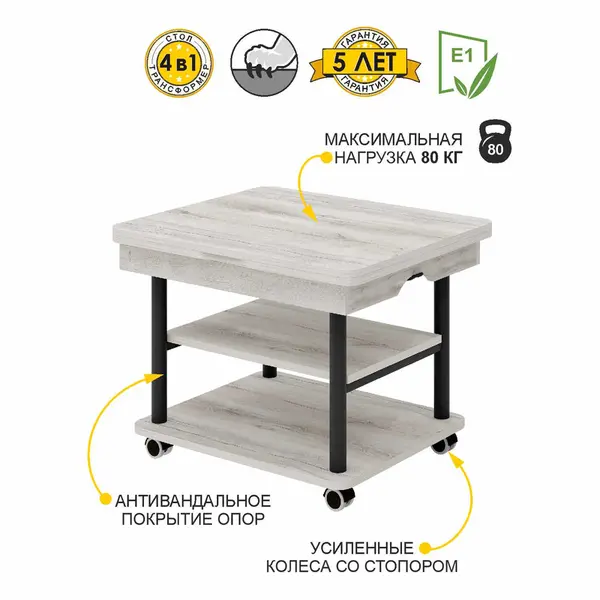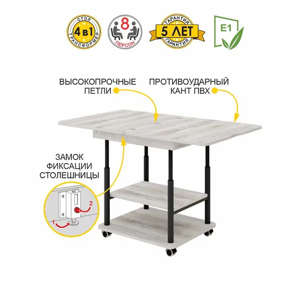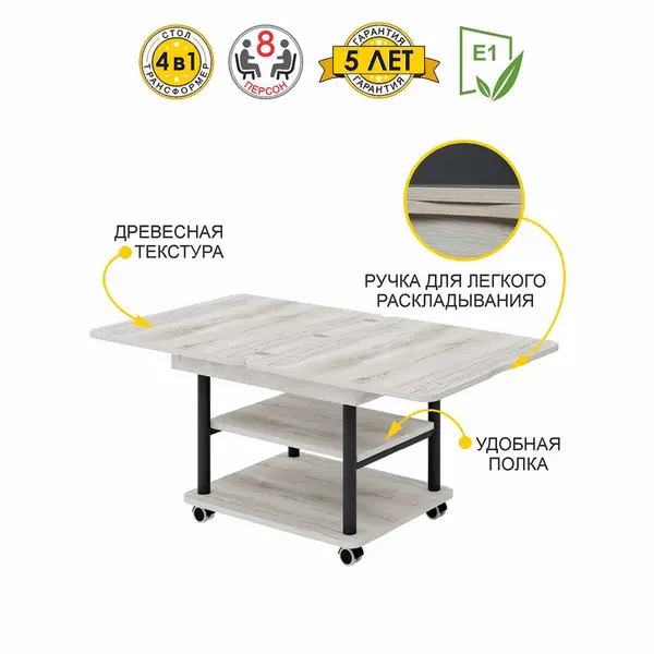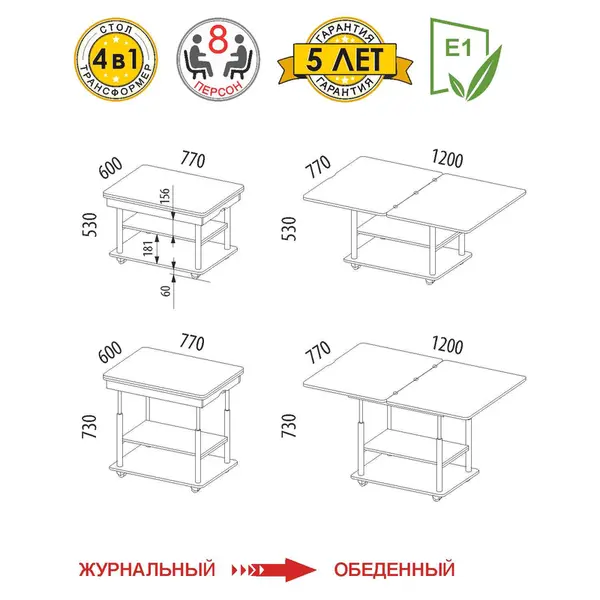 • Раскладной журнальный стол-трансформер легко превращается в обеденный или письменный стол и имеет четыре варианта трансформации. За одну цену Вы приобретаете 4 стола: 2 журнальных – один компактный, второй – с увеличенной столешницей, а также 2 обеденных стола – на 4 и 8 персон.