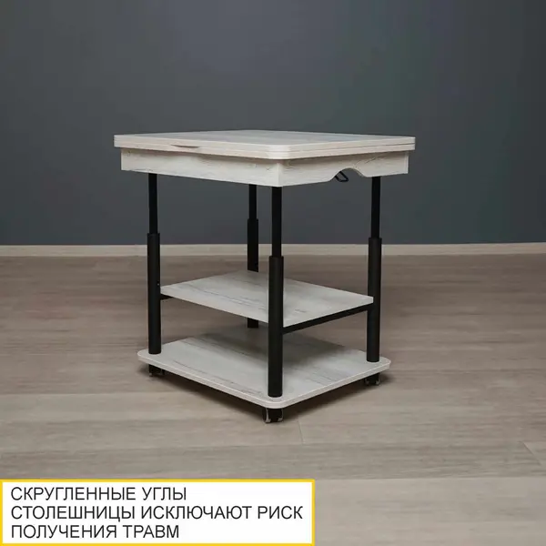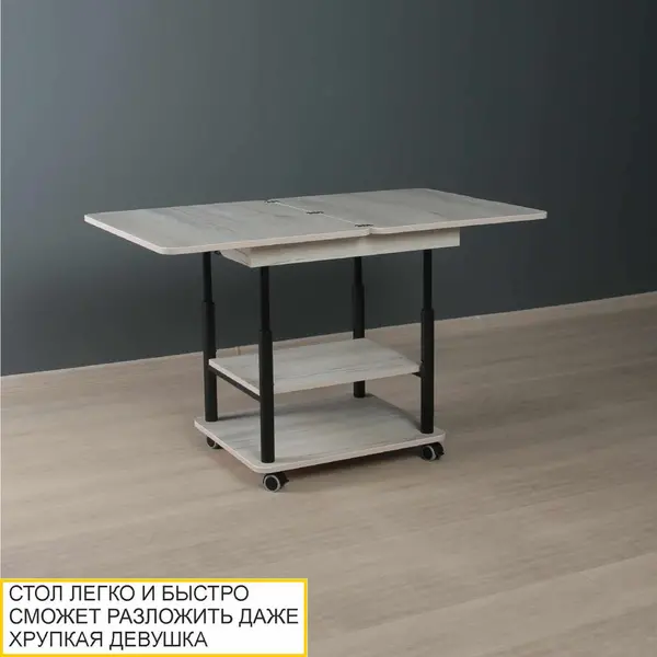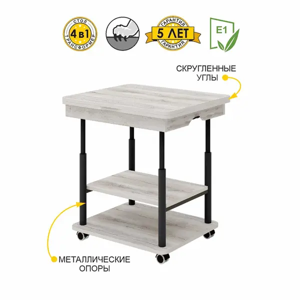 • Подъемный механизм легко и просто позволяет преобразовать журнальный стол в обеденный, увеличивая высоту до 73 см. Благодаря подъемному механизму стол может использоваться как кофейный столик, а также как полноценный стол для кухни или для гостиной.