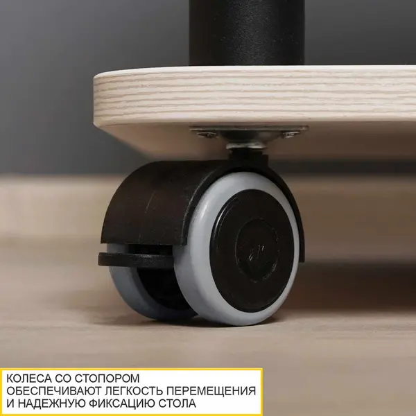 • Усиленные поворотные колеса со стопором позволяют зафиксировать стол в нужном положении для удобства его трансформации.