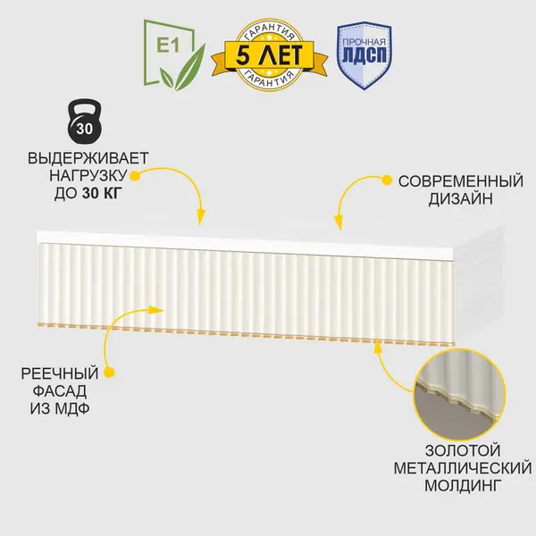 • Корпус изделия изготовлен из ЛДСП класса эмиссии Е1 - данный материал безопасен для здоровья и рекомендован к производству мебели для кухни, спальни и детских комнат.
