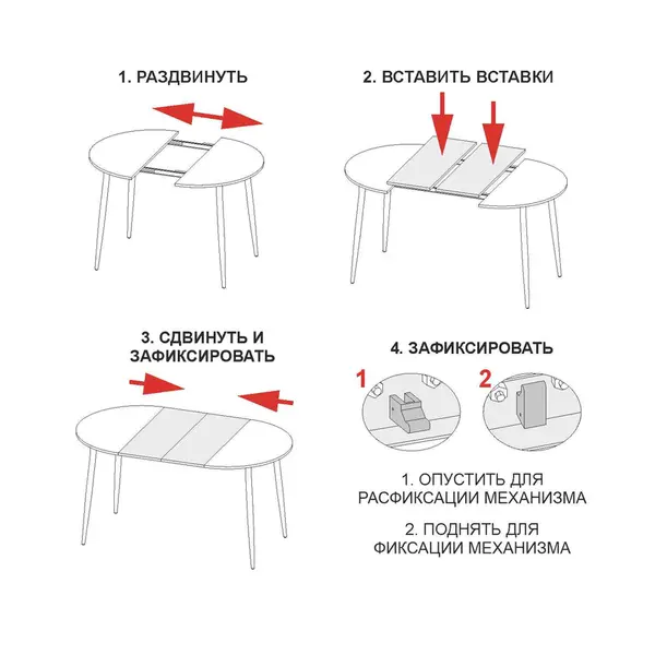 • Благодаря удобному механизму трансформации стол легко и быстро сможет разложить даже хрупкая девушка. Для того чтобы процесс трансформации был еще удобнее и проще, мы рекомендуем использовать замок фиксации столешницы.