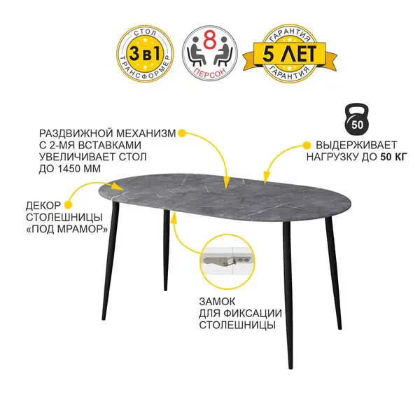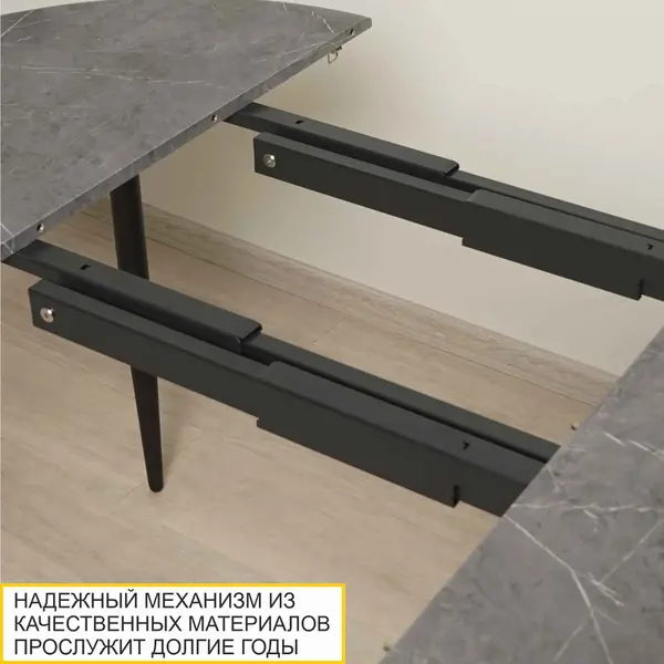 • Раздвижной механизм с 2-мя вставками увеличивает размер столешницы на 30 см и на 60 см. Удобно разместить как маленькую, так и большую компанию в любой праздник.