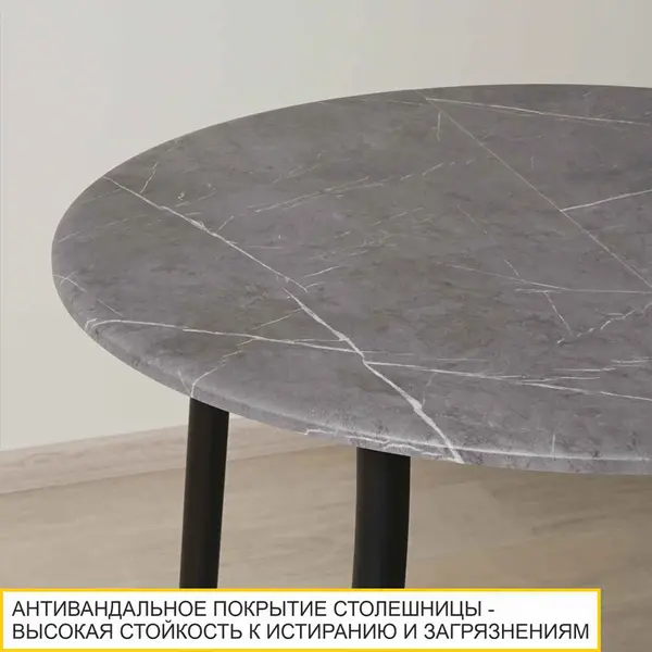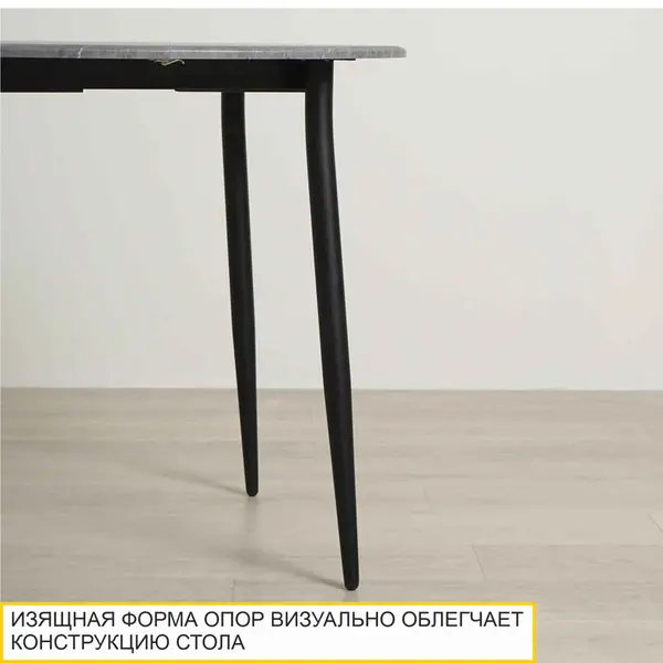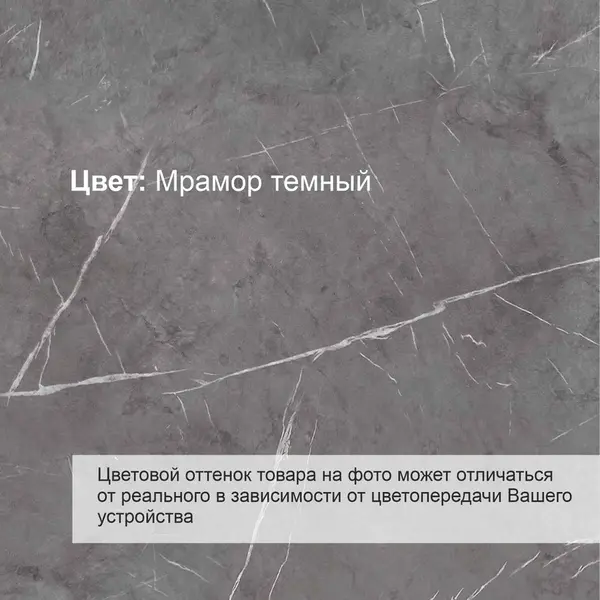 Стол выполнен в темно-сером цвете, который является базовым. Он прекрасно сочетается с различными оттенками и может быть с успехом применен в разнообразных стилях. Особое внимание привлекает текстура мрамора – это прекрасное решение для современного интерьера. Каждая столешница имеет неповторимую многогранность рисунка.