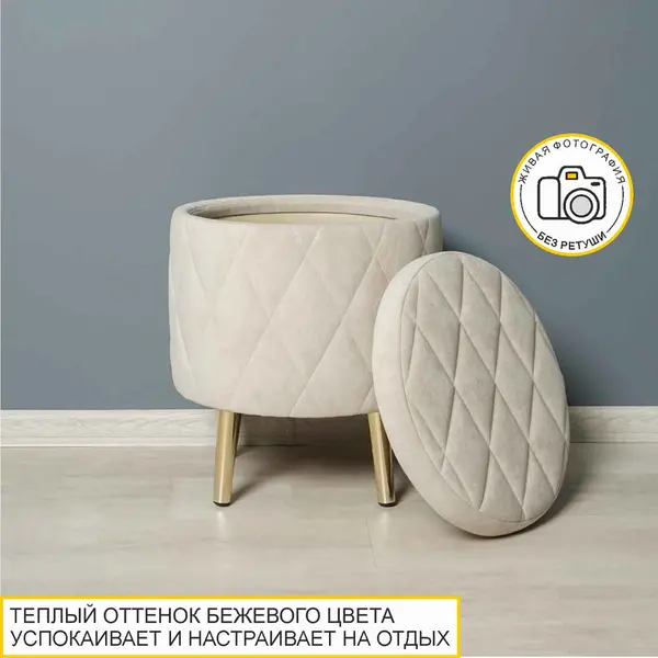 Пуфик выполнен в универсальном светло-бежевом цвете. Он выгодно подчеркивает уютную атмосферу интерьера. Теплый оттенок бежевого успокаивает и настраивает на отдых, а приятная на ощупь фактура ткани не оставит Вас равнодушными.