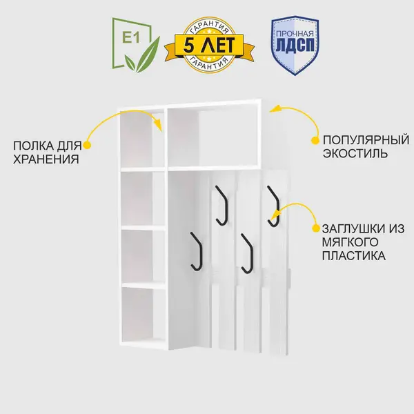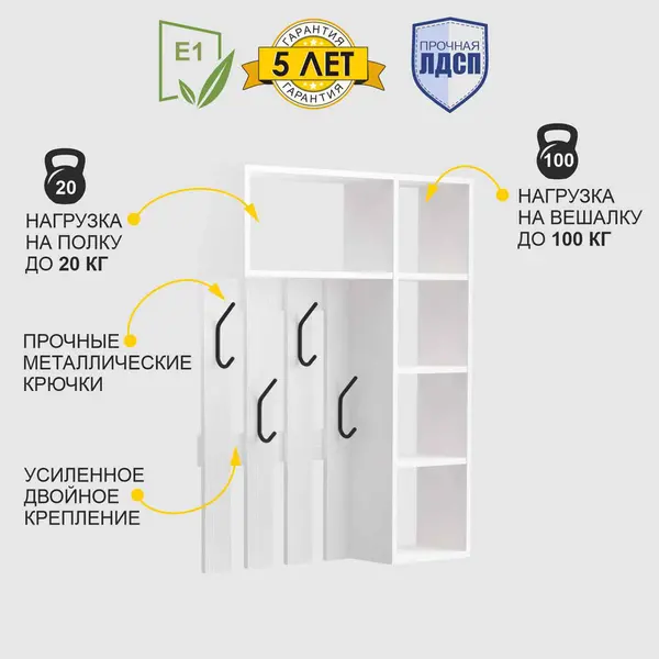 • Вешалка настенная для прихожей изготовлена из ЛДСП класса эмиссии Е1. Данный материал безопасен для здоровья и рекомендован к производству мебели для прихожих, спален и детских комнат.