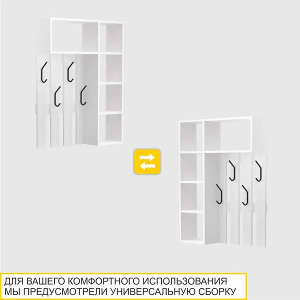 • Для Вашего комфортного использования мы предусмотрели возможность универсальной сборки. Шкаф можно разместить как с левой, так и с правой стороны от панели с крючками.