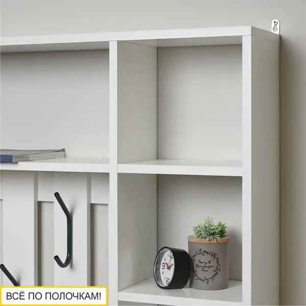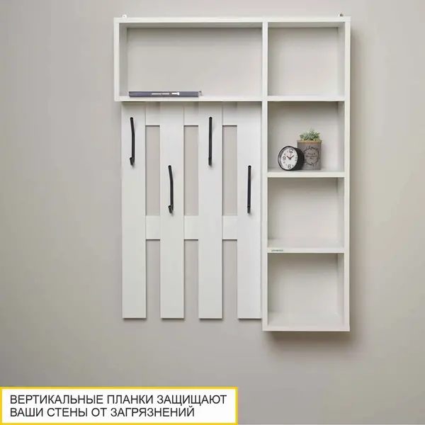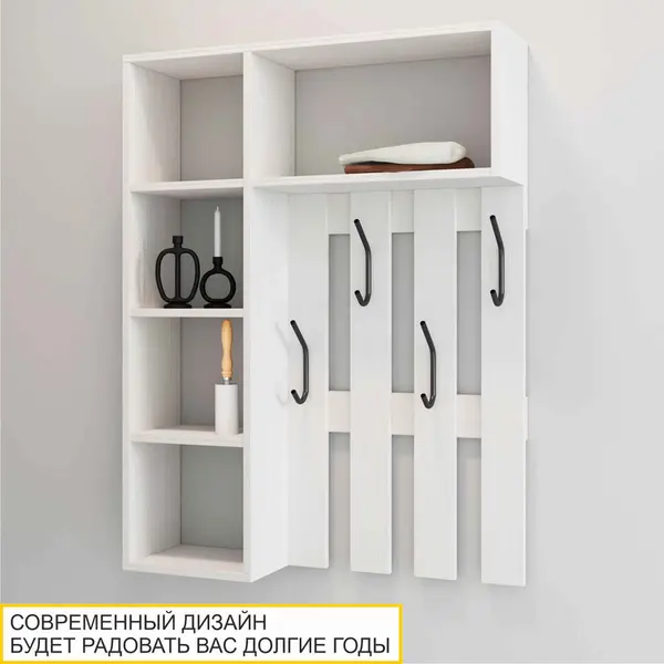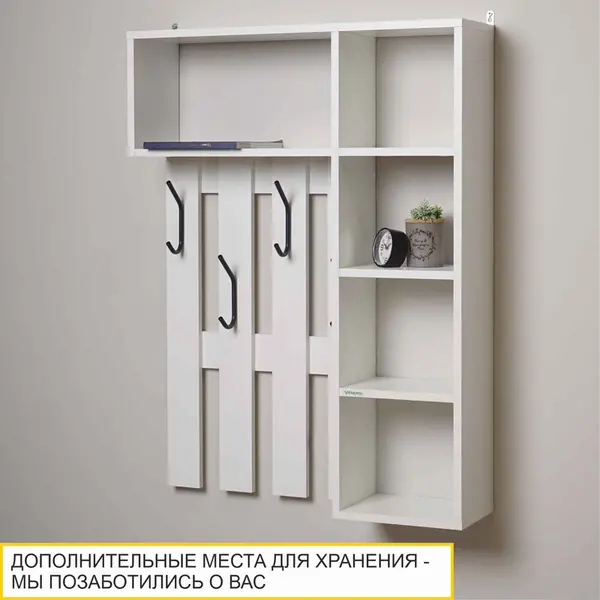 Вешалка выполнена в белом цвете, который является актуальным и универсальным решением. Его можно сочетать с любыми другими цветами и фактурами. В то же время он добавляет интерьеру свежести и визуально расширяет пространство.