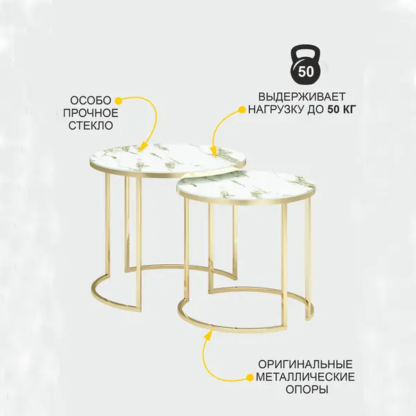 • Оригинальный комплект из двух журнальных столиков можно комбинировать по-разному, создавая интересные интерьерные решения. Столики 50 см и 60 см идеально дополняют друг друга, при этом каждый может использоваться самостоятельно. Это отличный вариант для применения в качестве кофейного и журнального столиков, прикроватной тумбы или изящного предмета декора. За одну цену Вы получаете два стола.