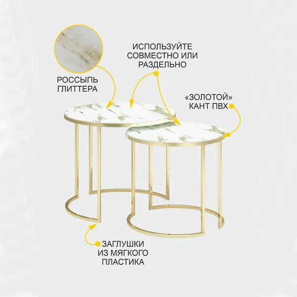 • Кант ПВХ, выполненный в золотом цвете, подчеркивает изысканный внешний вид столиков и делает их образ завершенным.