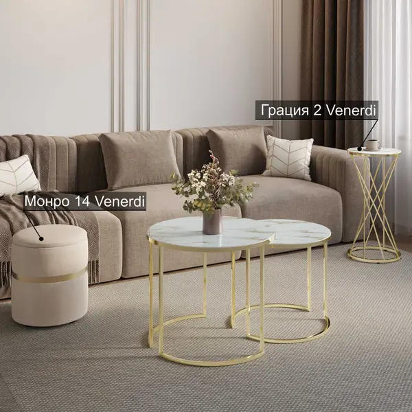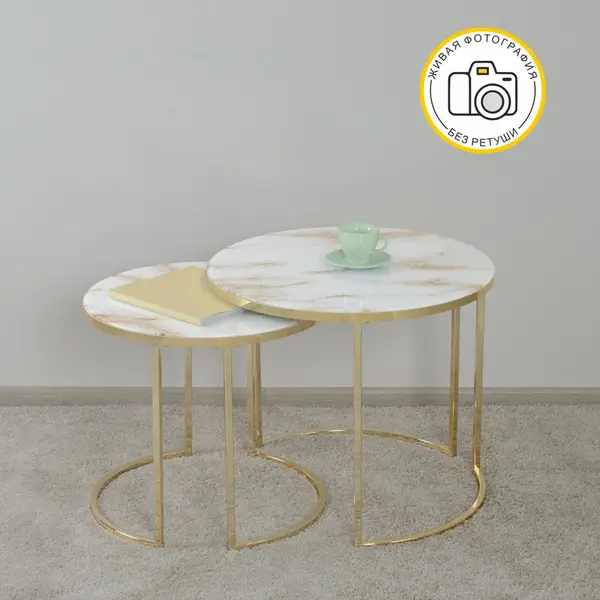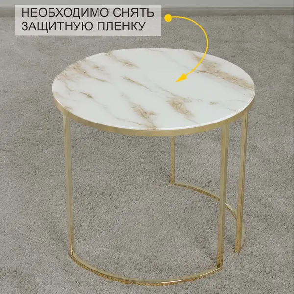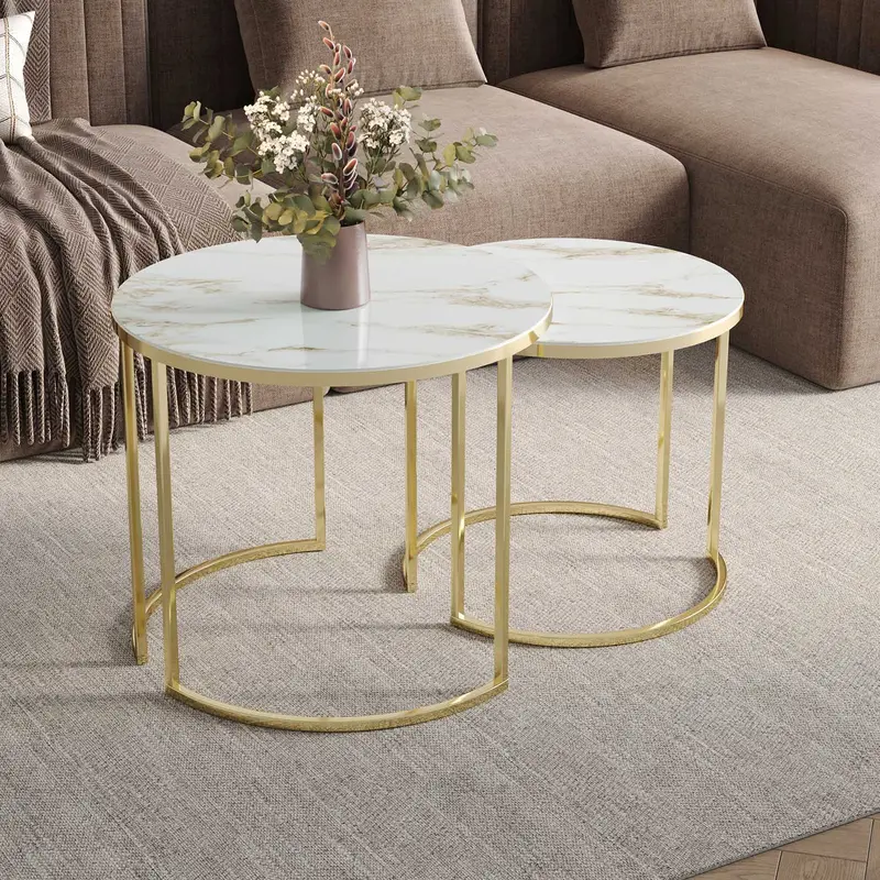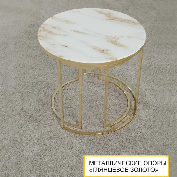 Оттенок столешницы комплекта журнальных столов включает в себя классические белые тона и изысканность мрамора. А в сочетании с золотыми опорами создает неповторимый образ.