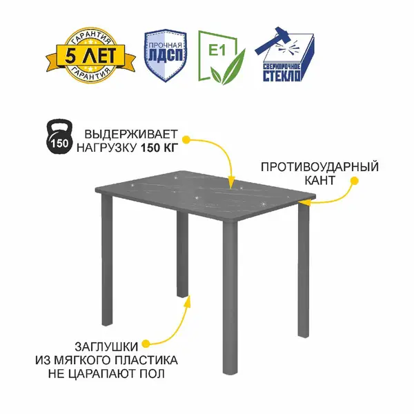 • Столешница выполнена из ЛДСП и стекла. ЛДСП повышенной прочности, материал устойчив к механическому истиранию и термическому воздействию. Выдерживает min 200 циклов истирания (по ГОСТу min 65) что больше, чем у многих производителей.