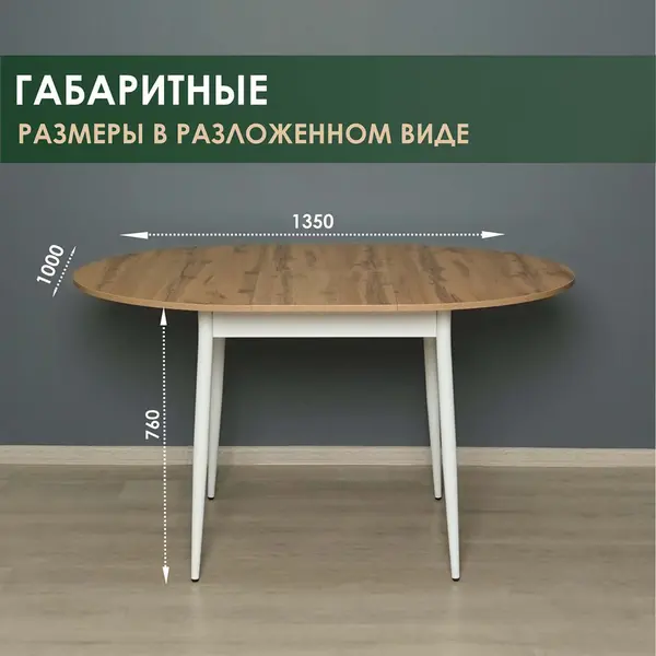 • Размер обеденного стола в сложенном виде (ШхГхВ) – 100х100х76 см, а в полностью разложенном (ШхГхВ) – 135х100х76 см.