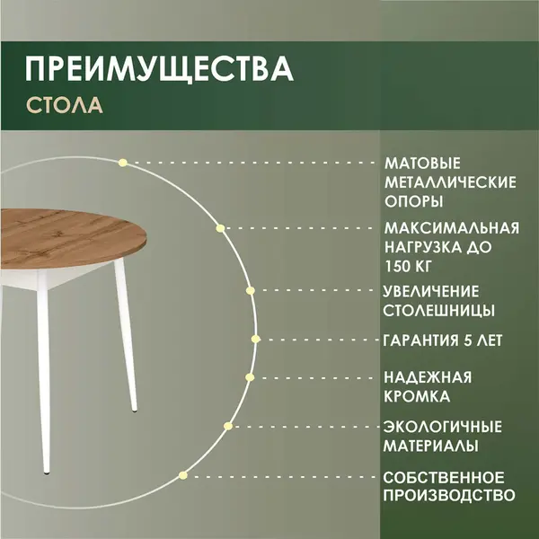 • Собственное мебельное производство позволяет нам контролировать качество наших товаров на всех этапах — от разработки модели до контрольной сборки перед доставкой изделия нашим клиентам. Мы внимательно следим за тенденциями рынка и выбираем только лучших поставщиков материалов для нашего производства. Срок гарантии на стол кухонный круглый раздвижной 100 см составляет 5 лет.