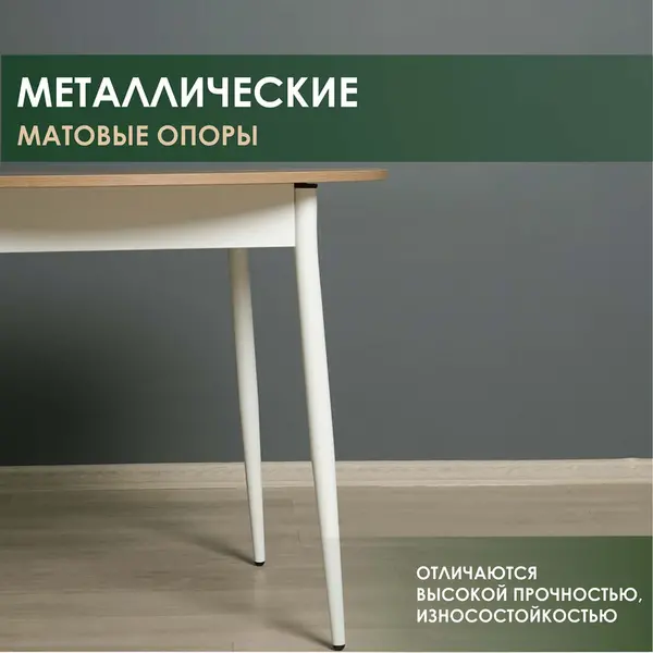 Столешница выполнена в насыщенном оттенке древесной фактуры в сочетании с белым цветом опор и подстолья. Такое сочетание подходит для различных стилей интерьера.