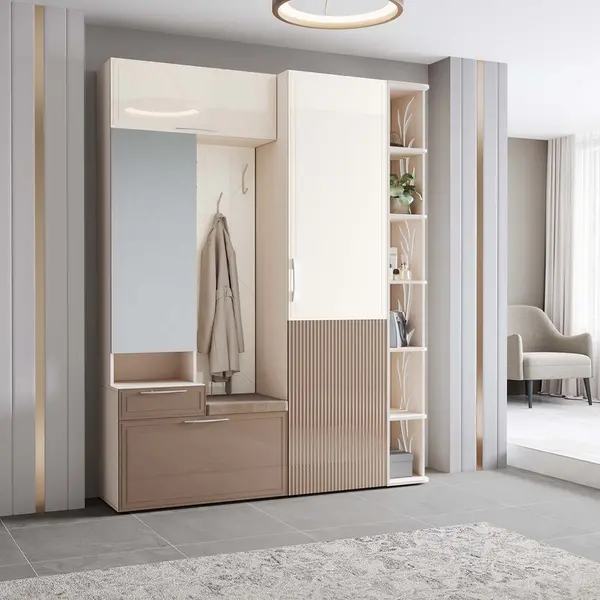 • В нижней части модуля за откидной дверцей находятся полки для обуви, в верхней части — крючки для одежды и полка для головных уборов. Встроенное мягкое сиденье обеспечивает дополнительный комфорт.