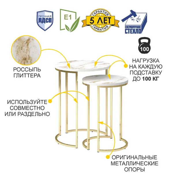 • Россыпь глиттера на столешнице придает утонченное мерцание дизайнерскому рисунку, подчеркивает уникальность комплекта столиков и привлекает внимание.