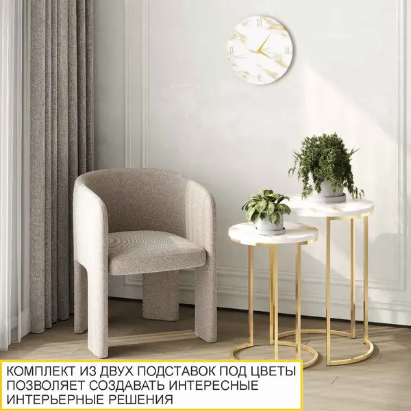 Комплект из двух подставок выполнен в благородном белом и золотом цвете. Такое сочетание добавляет нотку роскоши и особой атмосферы Вашей комнате. Декор «мрамор» с мерцающим золотым рисунком придает изысканный и элегантный внешний вид изделию.