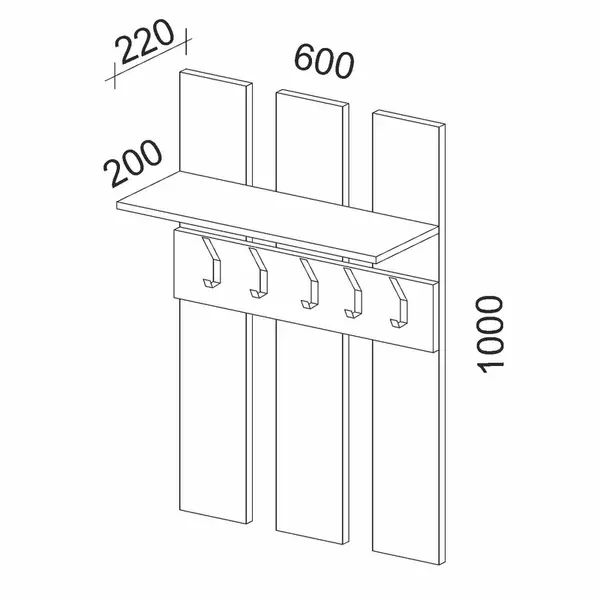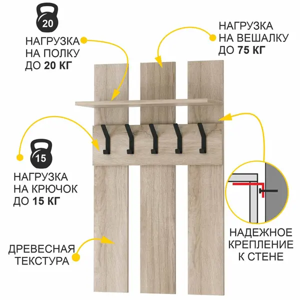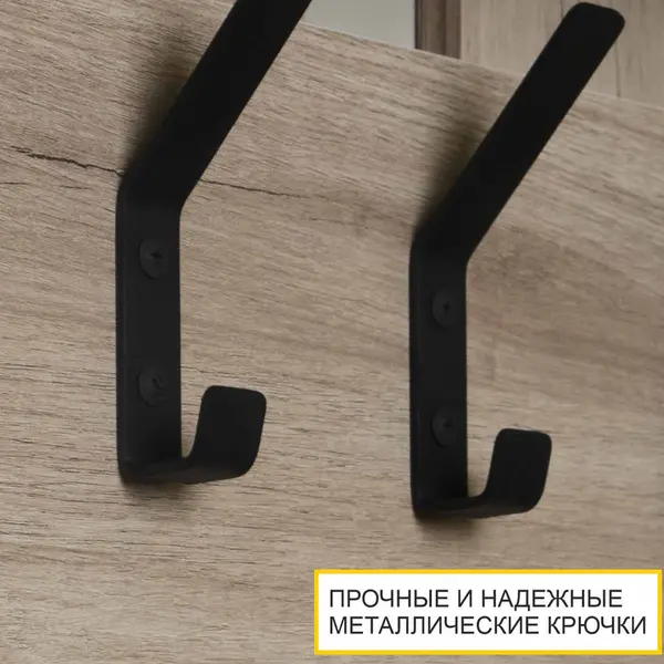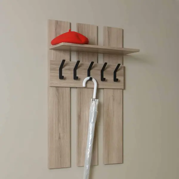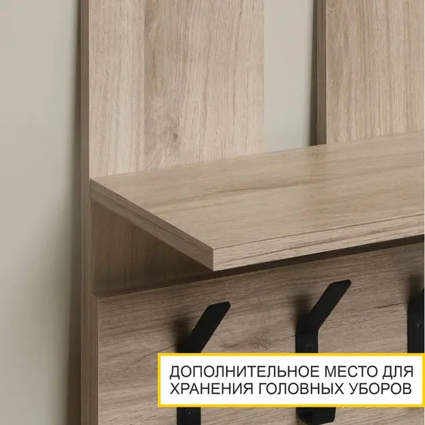 • Вешалка настенная в прихожую оснащена полкой, что обеспечивает дополнительное место для хранения головных уборов и аксессуаров.