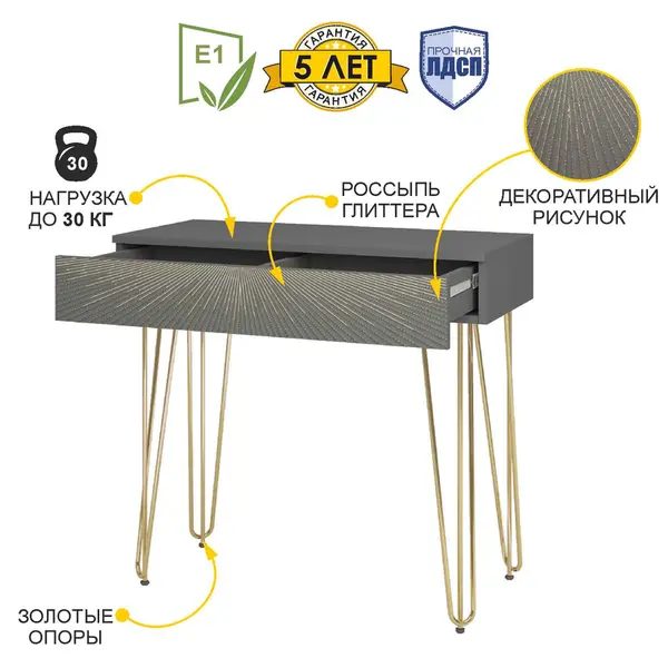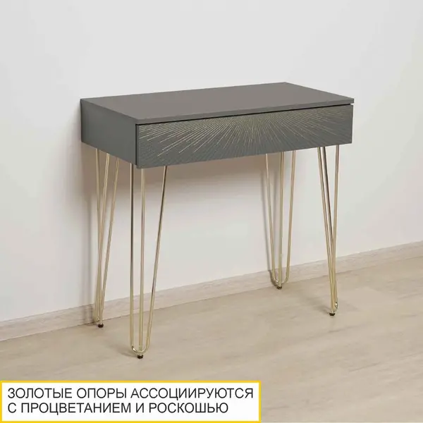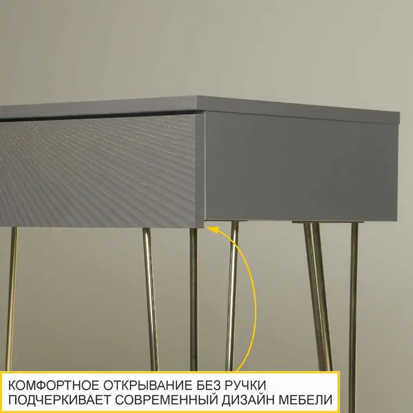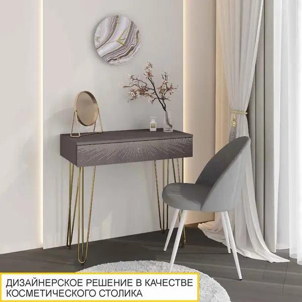 Туалетный столик выполнен в базовом сером цвете. Он прекрасно сочетается с различными оттенками и может быть успешно применен в разнообразных стилевых решениях.