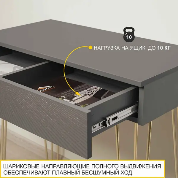 • Консоль оснащена вместительным ящиком с шариковыми направляющими полного выдвижения, что позволяет удобно организовать хранение важных предметов.