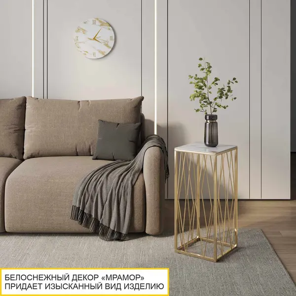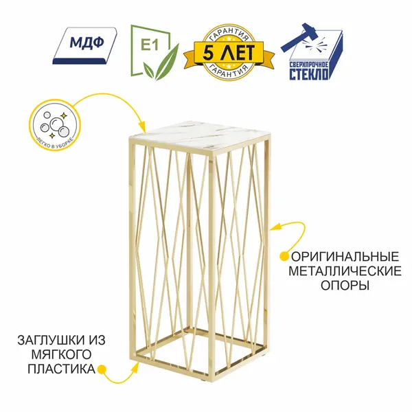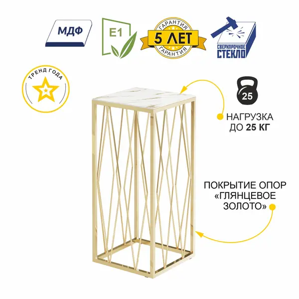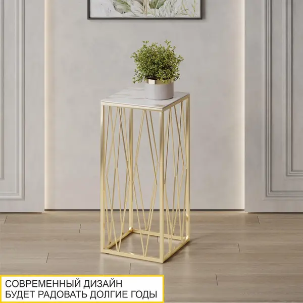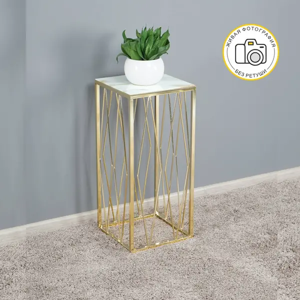 Подставка под цветы выполнена в сочетании благородного белого и золотого цветов. Такое сочетание добавит нотку роскоши в интерьер Вашего дома. Декор «мрамор» придает изысканный и элегантный внешний вид изделию.